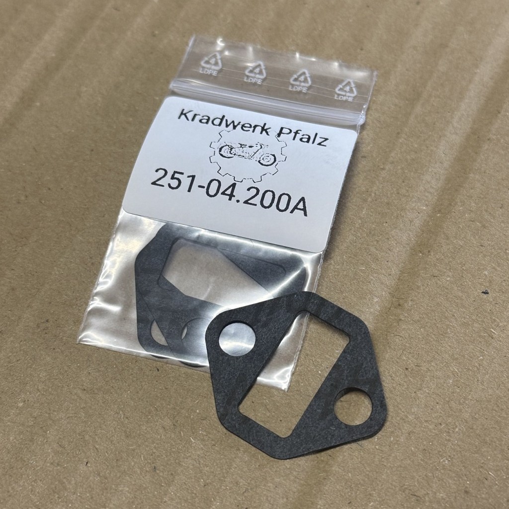 Papierdichtung für das Isolierstück 251-04.200 der 255er Motoren (passt eventuell auch an KM48&KM50). Die Papierdichtungen waren Original nie einzeln erhältlich, sondern wurden mit dem Isolierstück (Achtung, besteht Original aus Asbest) verklebt geliefert. Diese Dichtungen können mit etwas Flüssigdichtung, wir empfehlen Loctite 574, auf dem alten Isolierstück verklebt werden. Wir arbeiten an Nachbauten der Isolierstücke aus Novotex. Die Dichtungen sind anhand des Originals konstruiert und aus Elring Abil N 0,5mm gelasert.