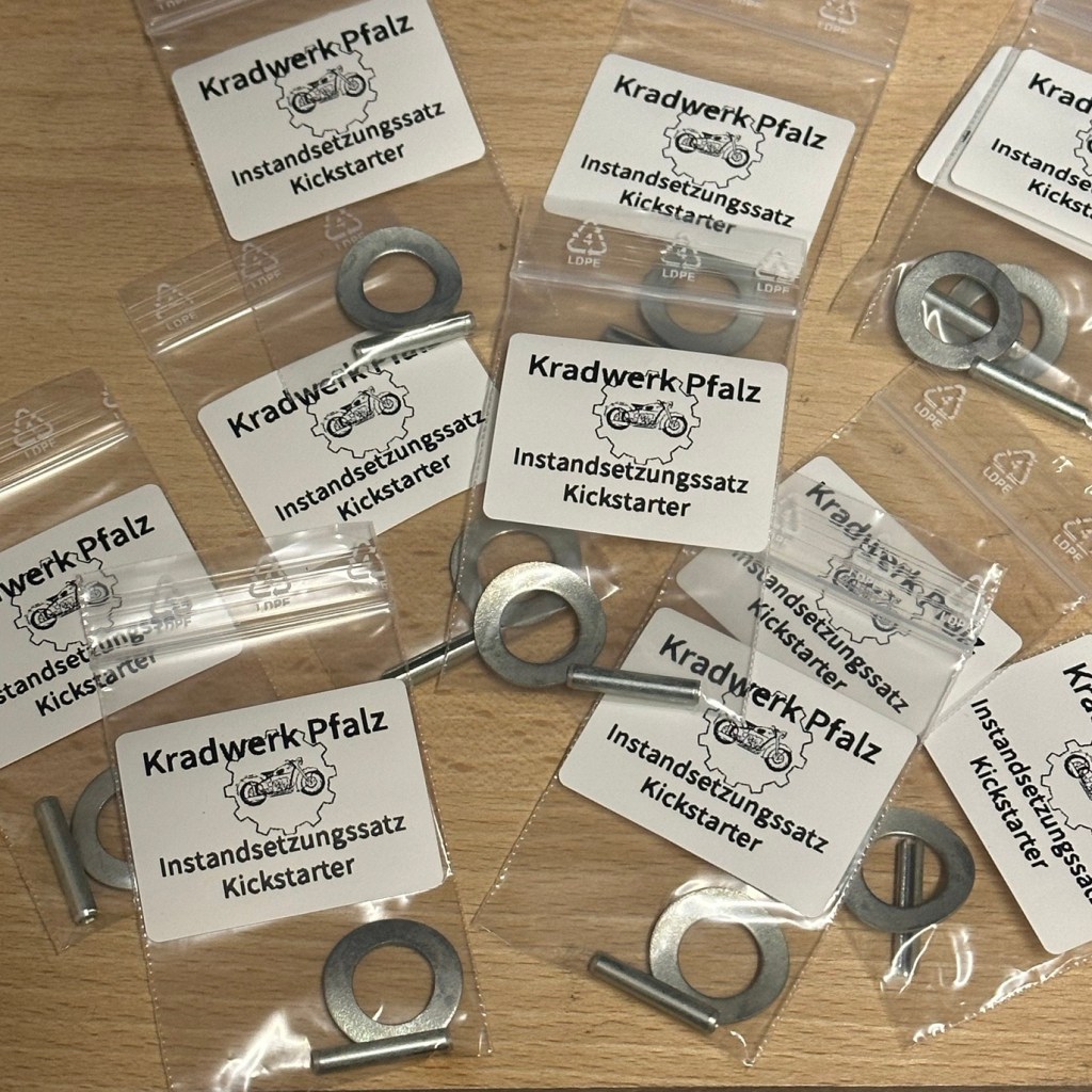 Instandsetzungssatz für Kickstarter mit obenliegendem Drehpunkt (z.B. C50 Sport/Super etc.) Bestehend aus Federscheibe 284-05.106 & Spannhülse DIN1481 3×8, beides galvanisch verzinkt. Beseitigt nerviges klappern des Tretarms.