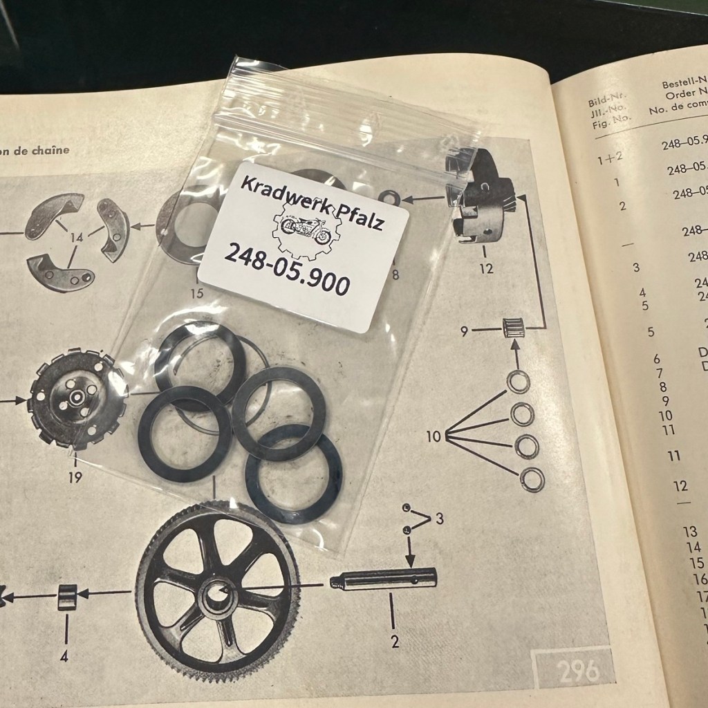 Scheibensatz 248-05.900 für Kupplungskorb der Motortypen 248 der Automaticmofa/-moped Modelle Typ 442. Bei beiden Versionen der Startkupplung benötigt. Bestehend aus je einer Scheibe 14,4×20,1×1,0; 14,4×20,1×1,1; 14,4×20,1×1,2 & 14,4×20,1×1,3. Hergestellt aus Federstahl, anschließend gehärtet und angelassen auf Gebrauchshärte. Nach Originalmaßen gefertigt.