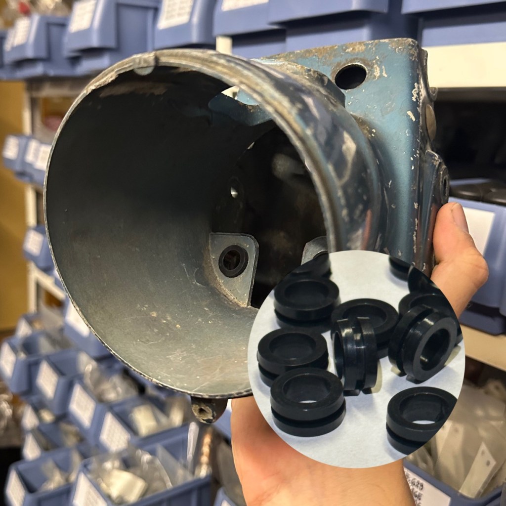 Gummibüchse 247-01.139 für Motorgehäuse und Zylinder der 247 “Bergsteiger” und für die Motorhalter der 446. Hergestellt nach Originalmaßen abgenommen von einem NOS-Teil, gefertigt aus sehr hartem NBR. Dadurch wackelt der Motor nicht wie bei aktuellen Nachbauten, allerdings lassen sich diese Büchsen auch schwerer einbauen. Kein Abguss oder 3D-Druck. Auf dem Bild im Vergleich mit abgenutzten Originalen.