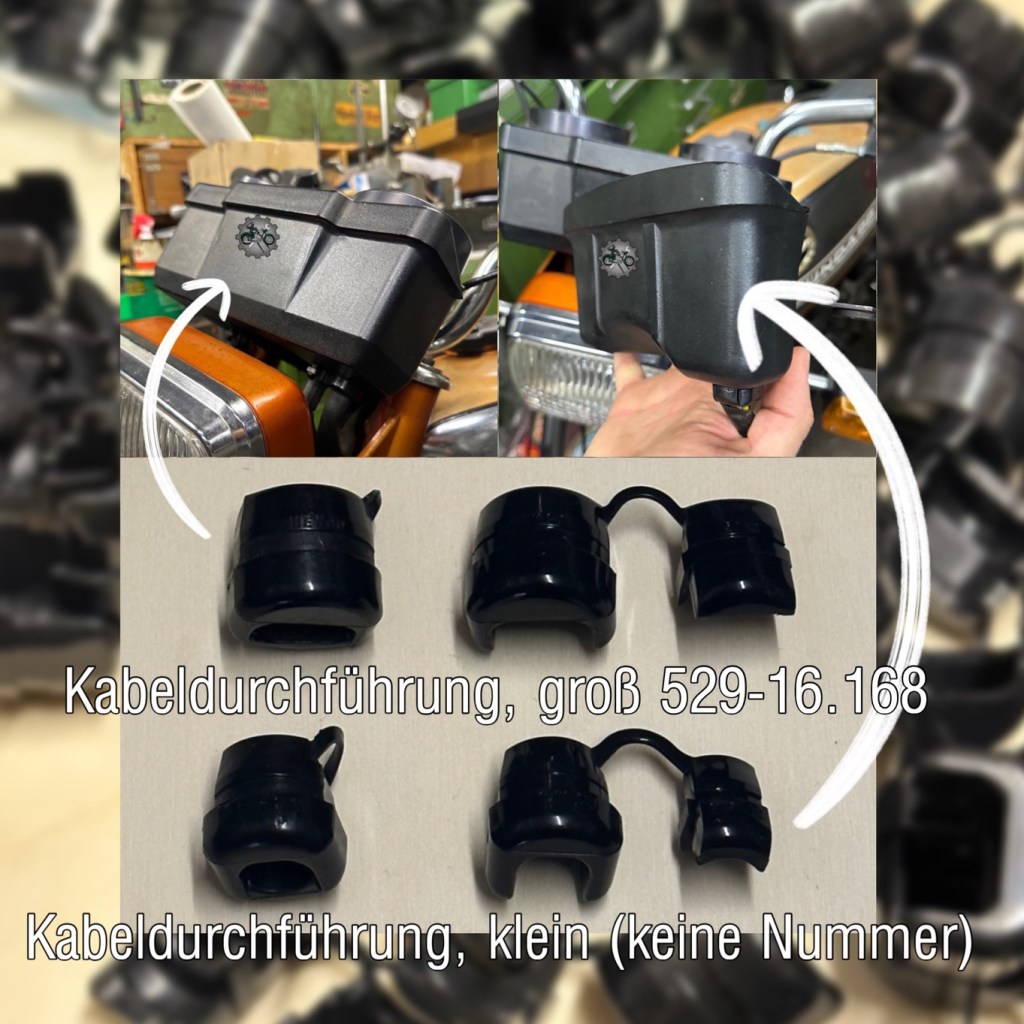 Kabeldurchführung, groß 529-16.168 für die großen Tachogehäuse der 529/530, 521, 448. Kabeldurchführung, klein (ohne Ersatzteilnummer) für die kleinen Tachogehäuse von z.B. 529 C50 Sport, 447, 460 und Ähnlich. Beide Sorten sind vom originalen Hersteller HEYCO. Dieses Teil wird zur Zugentlastung und Befestigung des Kabelstrangs im Cockpitgehäuse benötigt.